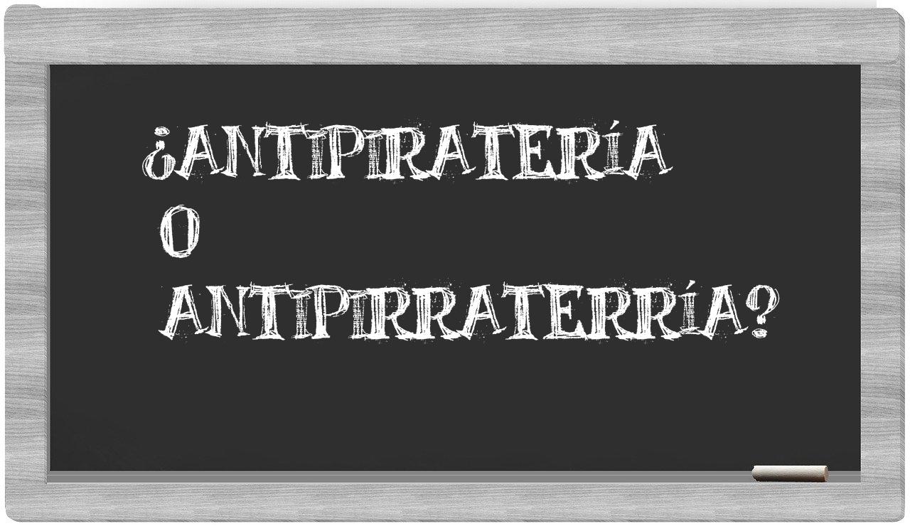 Cuando te encuentres entre los términos antipiratería y antipirraterría, no vaciles en tu elección, puesto que únicamente antipiratería es la forma adecuada; de hecho, antipirraterría no se encuentra registrada en el Diccionario de la Real Academia Española.