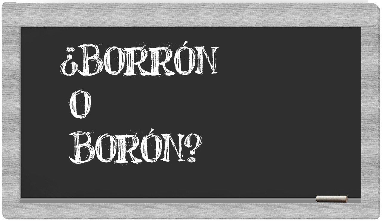Cuando confrontes las letras de borrón y borón, no deberías experimentar vacilaciones, puesto que únicamente borrón se encuentra redactada de manera apropiada; la palabra borón no se halla en el vocabulario del Diccionario de la Real Academia Española.