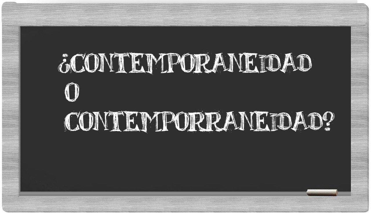 Cuando te enfrentes a la disyuntiva entre contemporaneidad y contemporraneidad, ten certeza de que solo contemporaneidad cuenta con la escritura adecuada, puesto que contemporraneidad no se encuentra registrada en el Diccionario de la Real Academia Española.