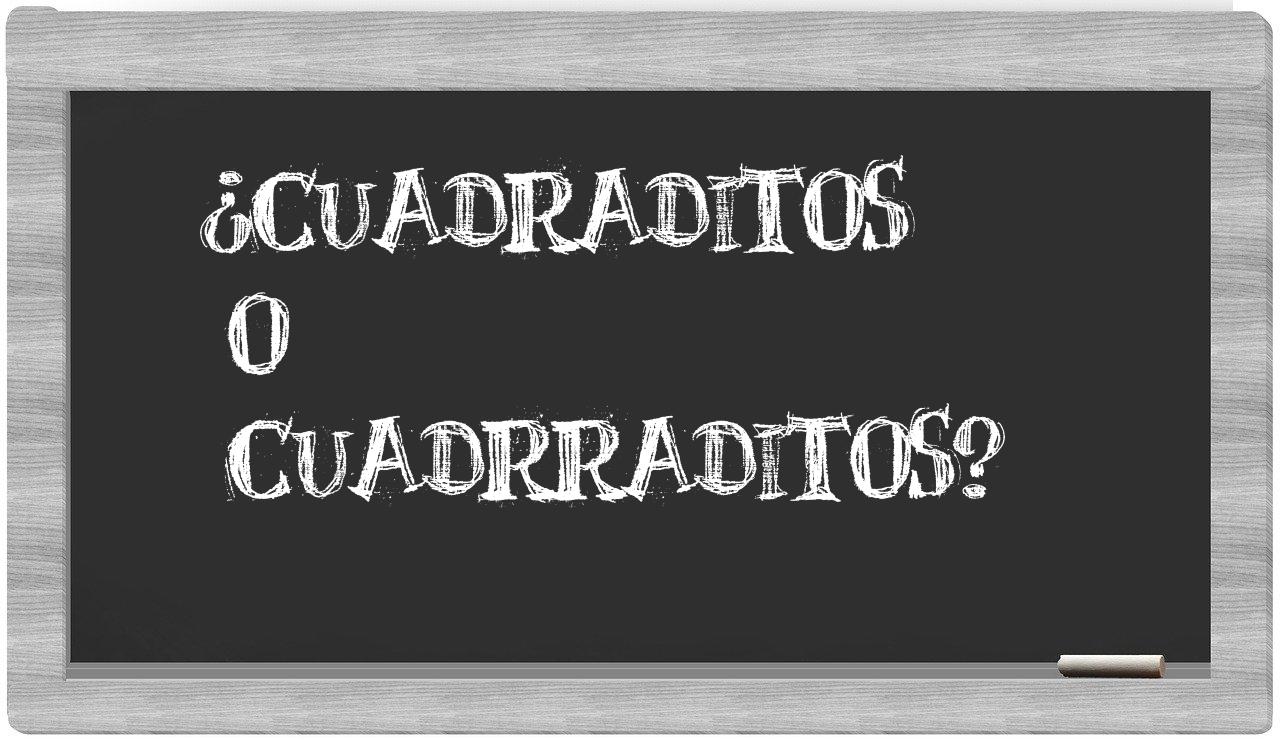 En la particular situación que se presenta entre los términos cuadraditos y cuadrraditos, es crucial que no titubees, puesto que únicamente cuadraditos se encuentra correctamente redactada. Por otro lado, cuadrraditos no se encuentra en el repertorio del Diccionario de la Real Academia Española.