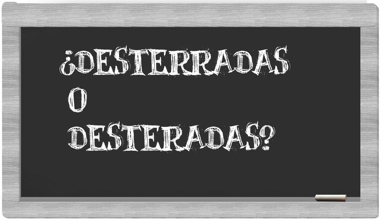 Cuando te enfrentes a la disyuntiva entre desterradas y desteradas, ten certeza de que solo desterradas cuenta con la escritura adecuada, puesto que desteradas no se encuentra registrada en el Diccionario de la Real Academia Española.