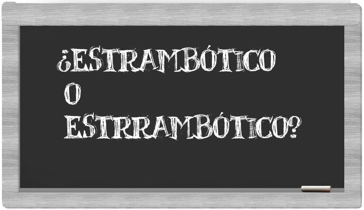 En la particular situación que involucra los términos estrambótico y estrrambótico, es fundamental que no titubee, puesto que únicamente estrambótico se encuentra correctamente formulada. La opción estrrambótico no está registrada en el Diccionario de la Real Academia Española.