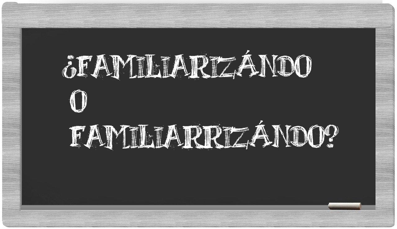 En lo que respecta a la distinción entre familiarizándo y familiarrizándo, nunca deberías titubear, puesto que únicamente familiarizándo se encuentra correctamente redactada. Por otro lado, familiarrizándo no figura en el prestigioso Diccionario de la Real Academia de la Lengua.