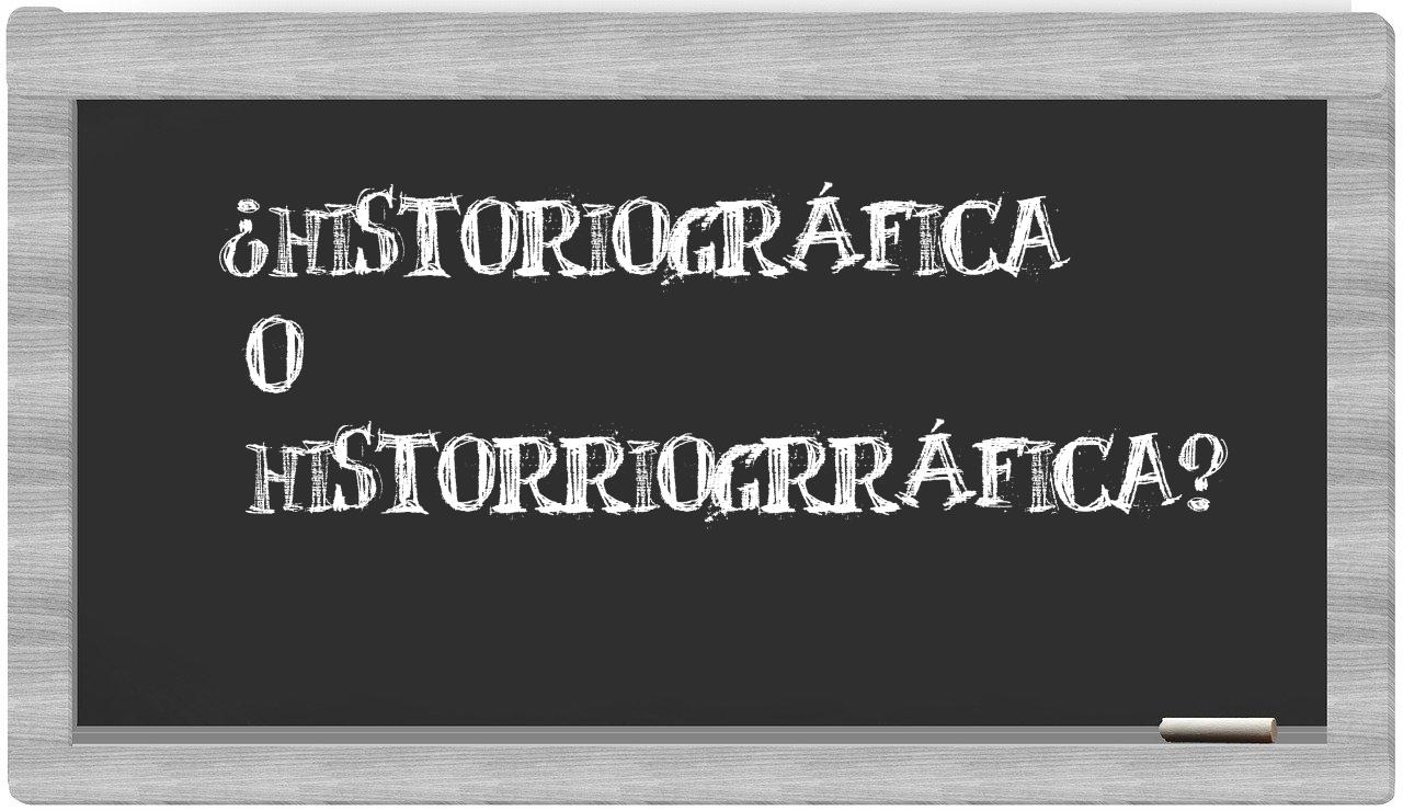 En la situación particular que involucra los términos historiográfica y historriogrráfica, es fundamental que no titubees, pues únicamente historiográfica se encuentra correctamente redactada; cabe destacar que historriogrráfica no figura entre las entradas del Diccionario de la Real Academia de la Lengua.