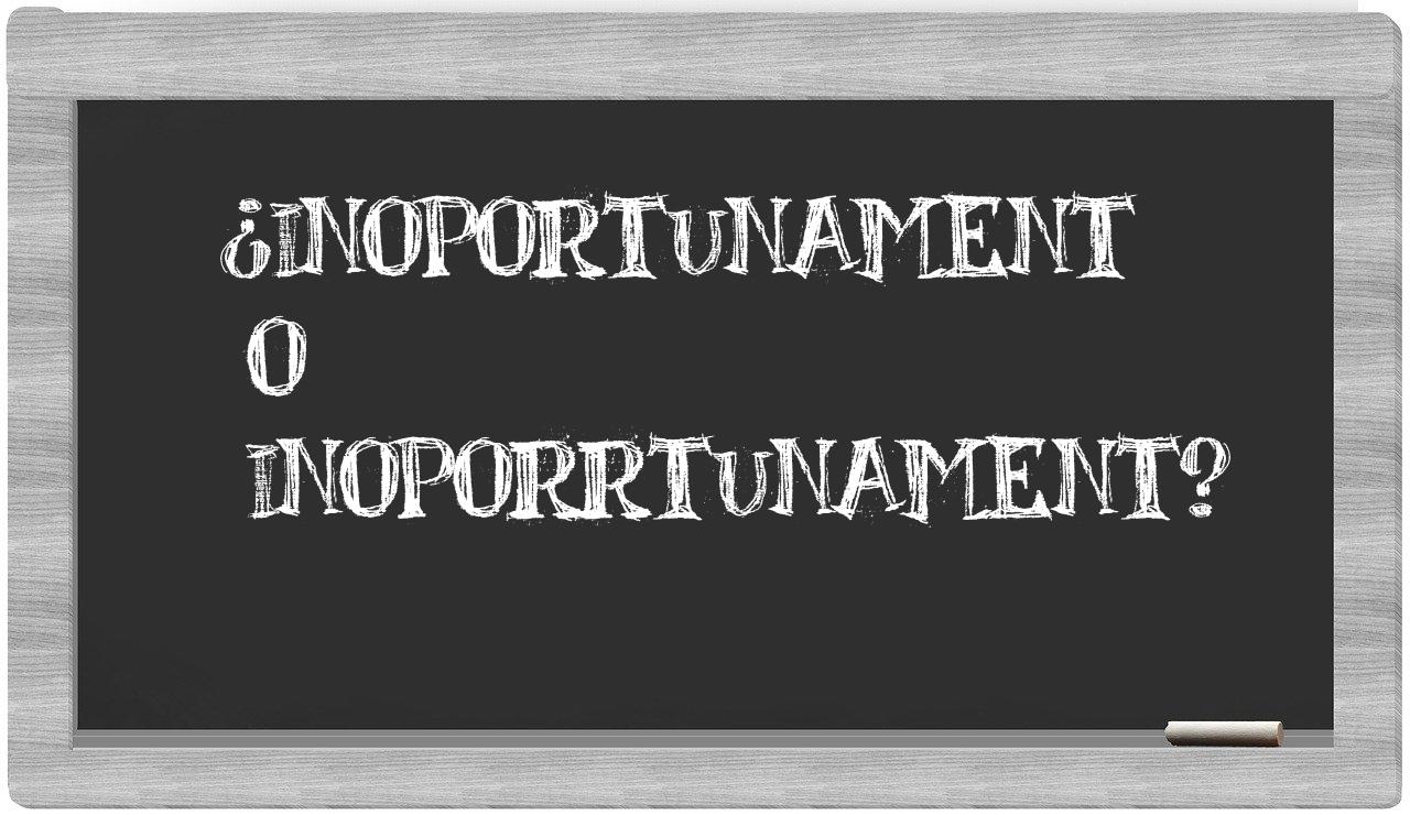 Cuando se trata de la distinción entre inoportunament y inoporrtunament, no hay lugar para la incertidumbre, puesto que únicamente inoportunament se encuentra registrada adecuadamente. Por el contrario, inoporrtunament no figura en el Diccionario de la Real Academia Española.