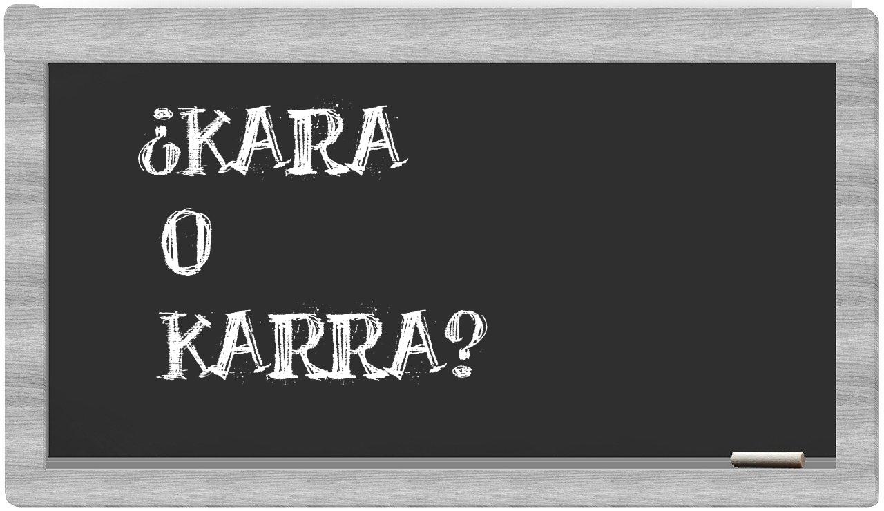 En la situación específica que involucra los términos kara y karra, no deberías titubear, pues únicamente kara se encuentra debidamente redactada. Por otro lado, karra no se halla en el léxico de la Real Academia de la Lengua.
