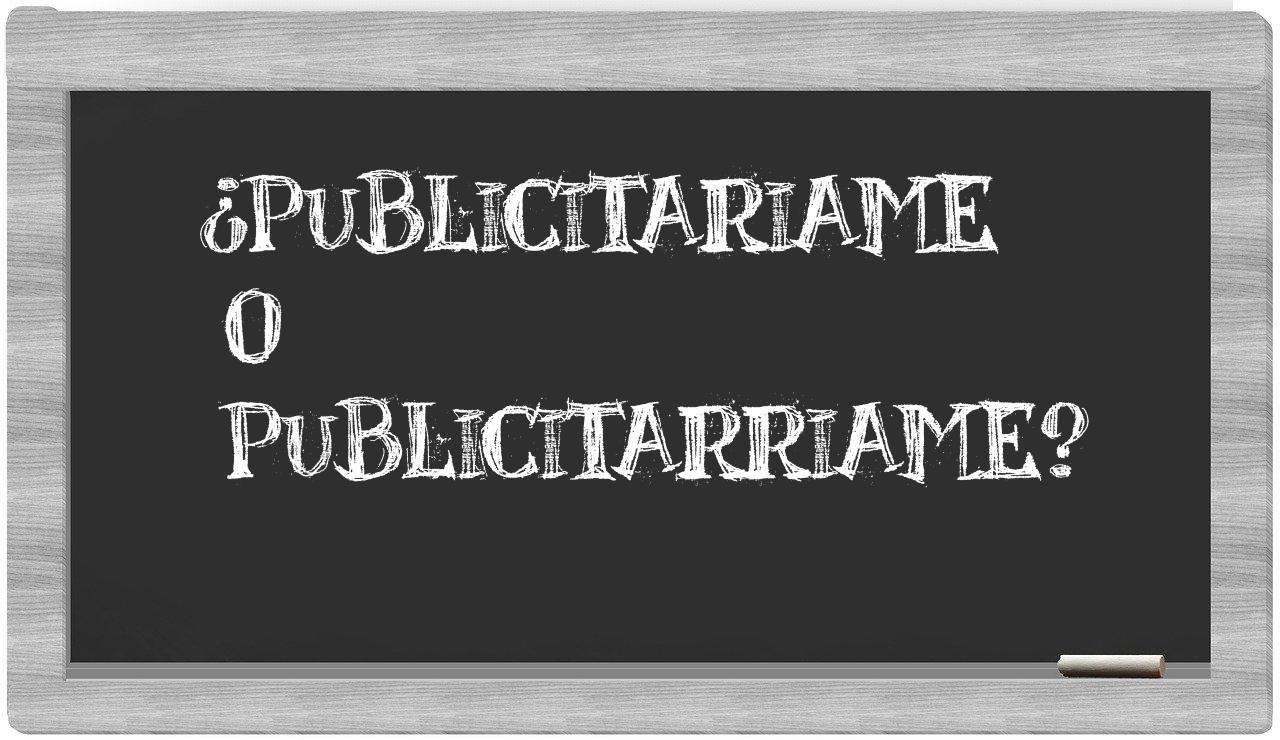 En la situación particular que involucra los términos publicitariame y publicitarriame, no deberías titubear en ningún momento, pues únicamente publicitariame es el que se encuentra debidamente redactado. El término publicitarriame no figura en el Diccionario de la Real Academia Española.