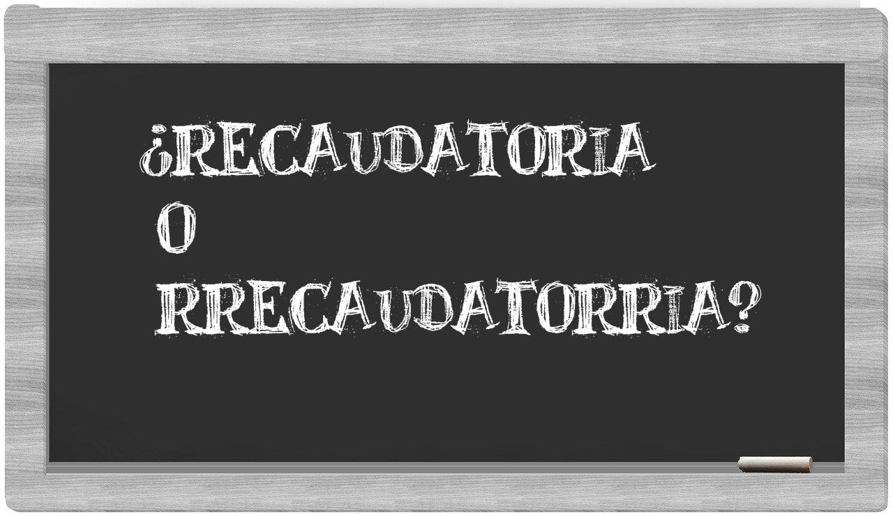 Cuando te encuentres en la situación de elegir entre recaudatoria y rrecaudatorria, es fundamental que no vaciles, puesto que únicamente recaudatoria es la opción adecuada. Ten en cuenta que rrecaudatorria no está reconocida por el Diccionario Oficial de la Real Academia Española.