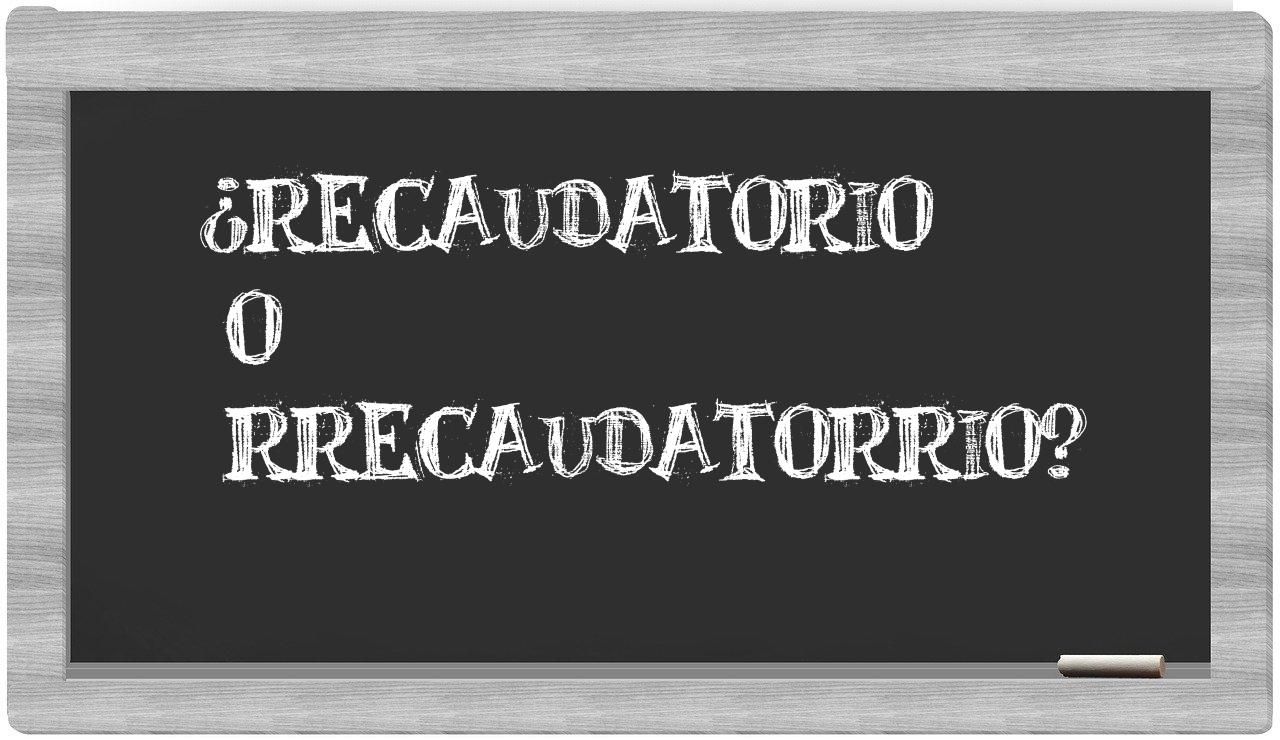 Cuando te encuentres ante la disyuntiva entre recaudatorio y rrecaudatorrio, no vaciles en tu elección, puesto que solo recaudatorio es la correcta; de hecho, rrecaudatorrio ni siquiera figura en el Diccionario de la Real Academia Española.