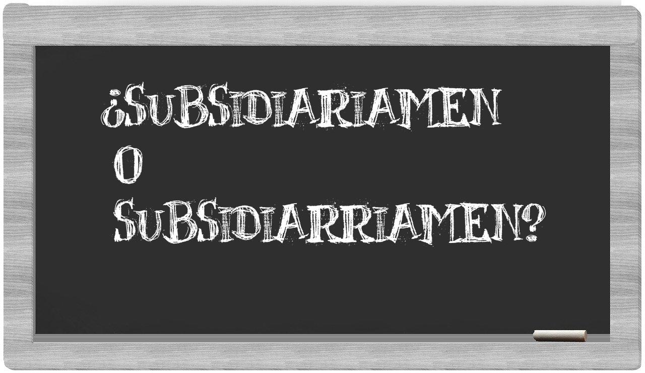 Cuando se trata de elegir entre subsidiariamen y subsidiarriamen, la decisión es evidente; únicamente subsidiariamen se encuentra registrada de manera adecuada. Por el contrario, subsidiarriamen no forma parte del vocabulario oficial de la Real Academia Española.