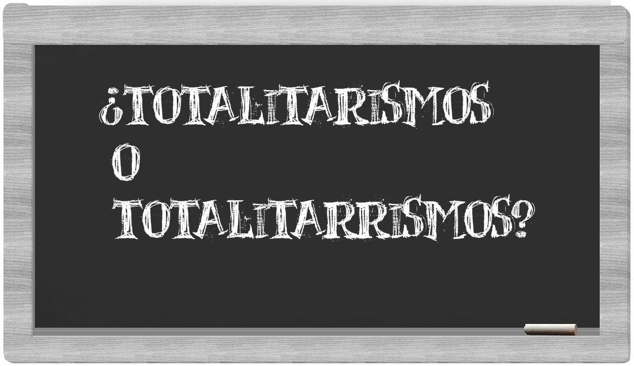 No deberías titubear en la elección entre totalitarismos y totalitarrismos, pues únicamente totalitarismos se presenta como la forma adecuada, mientras que totalitarrismos carece de reconocimiento en el Diccionario de la Real Academia Española.