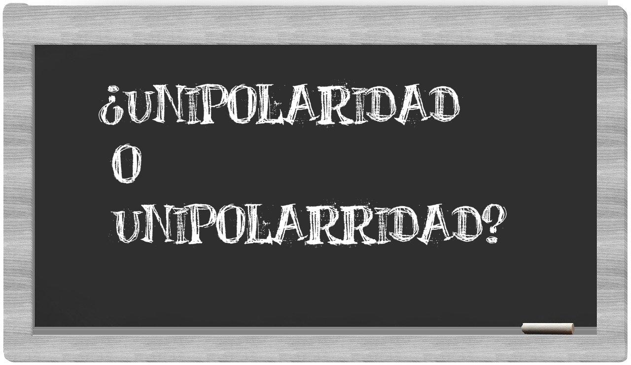 Cuando se trata de la discrepancia entre unipolaridad y unipolarridad, es importante que no vaciles, porque únicamente unipolaridad se presenta como la opción correcta. Por otro lado, unipolarridad no se encuentra en el diccionario de la Real Academia Española.
